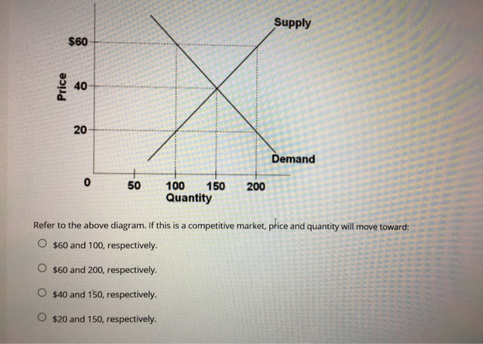 Refer to the above diagram, which shows demand and supply conditions in the competitive market for product X. If the initial demand and supply curves are D0 and S0, equilibrium price and quantity will be: The equilibrium price and quantity in this market will be: A. . If government levies a per unit excise tax of on suppliers of this product, equilibrium price and quantity will be: Refer to the diagram below, which shows demand and supply conditions in the competitive ... The equilibrium price and quantity in this market will be: The equilibrium price and | Chegg.com. Refer to the diagram. The equilibrium price and quantity in this market will be: A. $1.00 and 200. B. $1.60 and 130. C. $0.50 and 130. D. $1.60 and 290. If there is a surplus of a product, its price: A. is below the equilibrium level. B. is above the equilibrium level. D. will rise in the near future.