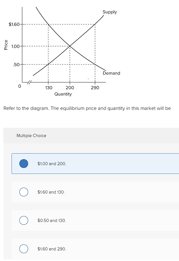 Refer to the diagram. the equilibrium price and quantity in this market will be A. $1.00 and 200. B. $1.60 ... C. $.50 and 130. D. $1.60 and 290.
