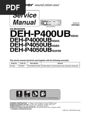 Service Manual for PIONEER DEH-P4000UB/XS/UC - Download Service Manual for PIONEER DEH-P4000UB/XS/UC, downloadable as a PDF file.. We also have owner's manual to this model.. Manual details. Immediate download after payment.; Delivered as a PDF file. The manual has 71 pages; File size: 8.07 MB; Available language versions: English Different language versions may vary sligthly in file size and page count.