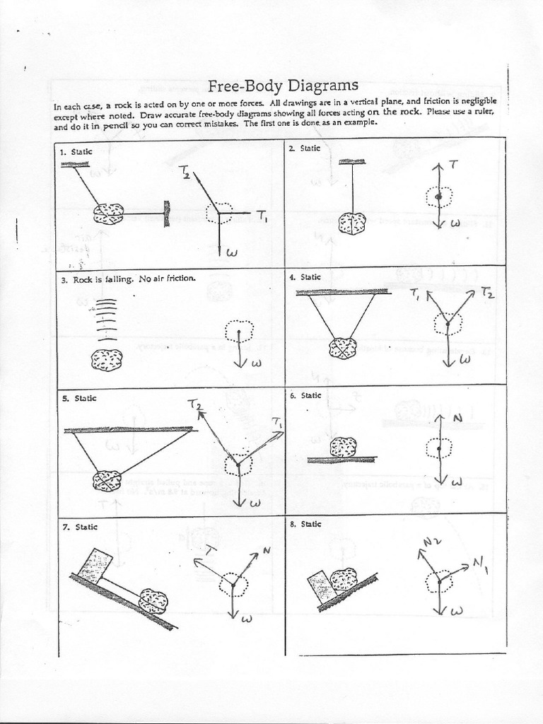 Free Body Diagrams - Worksheet | Teaching Resources Nov 25, 2020 · pdf, 979.83 KB This worksheet is designed for GCSE Physics students. It includes a series of questions of increasing challenge, with answers and extra supporting videos available at the link on the bottom of each page or via the QR code. Full written answers and a video explanation for this worksheet is also available. PDF Free-Body Diagrams - Ms. Poulton's Science & Math Class ... Construct free-body diagrams for the following physical situations. Label all forces (e.g, Fgrav, Fnorm, Fapp, Ffrict, Fair, Ftens, etc. ). a. A physics book rests upon a level table. b. A skydiver is falling and has reached a terminal velocity. c. A large crate is being pushed leftward at a constant velocity. d. A sledder has reached
